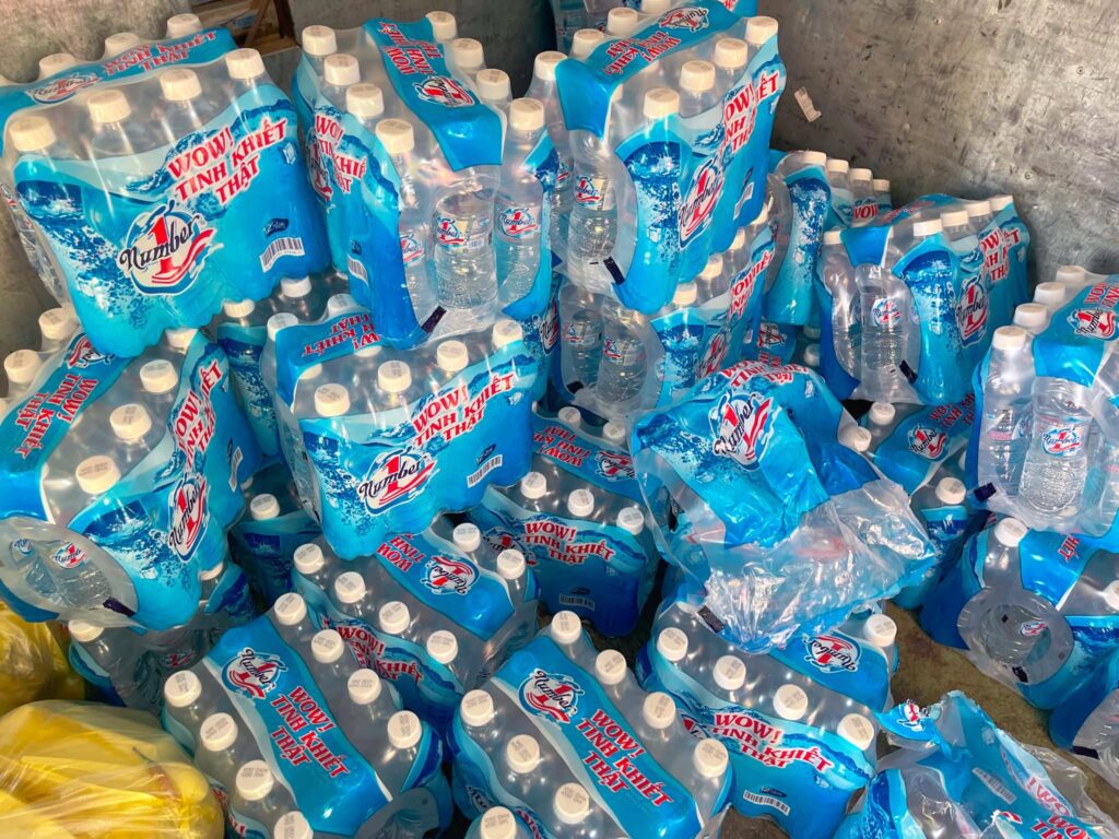 Mỗi suất ăn gồm có cơm trắng, thịt kho tiêu, rau xào, canh cải, nước suối.