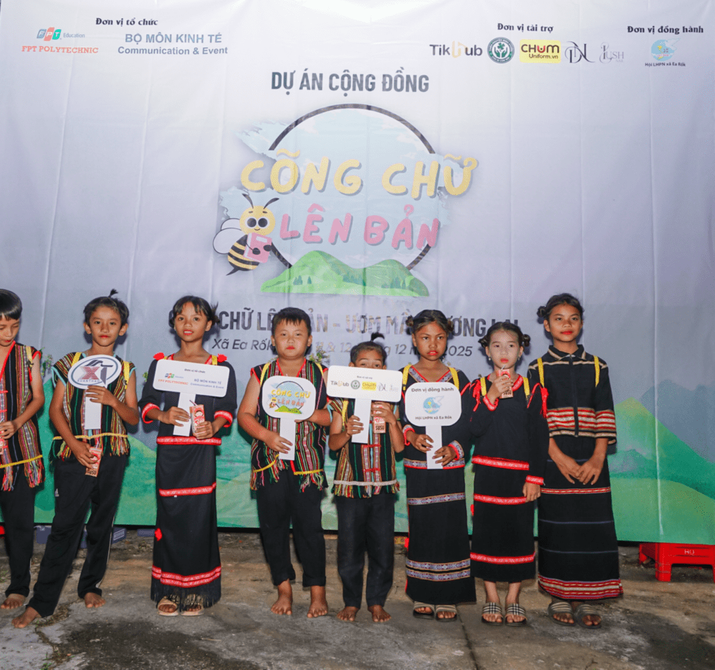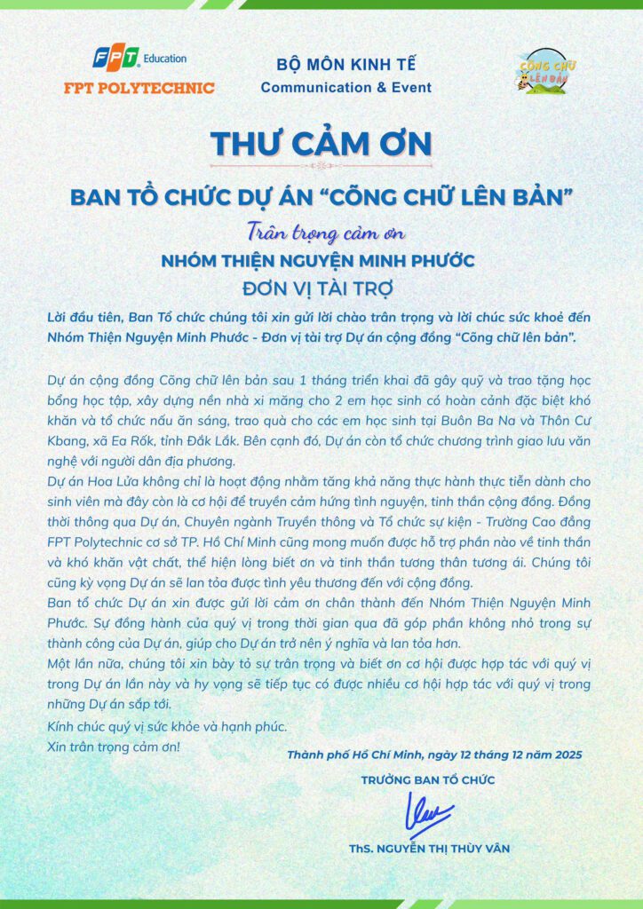 Là đơn vị tài trợ cho chương trình, Nhóm Thiện Nguyện Minh Phước rất vui khi được đồng hành cùng sinh viên nghành PR – Trường Cao đẳng FPT Polytechnic thực hiện dự án “ Cõng Chữ Lên Bản” tại xã Ea Rốk, tỉnh Đắk Lắk.