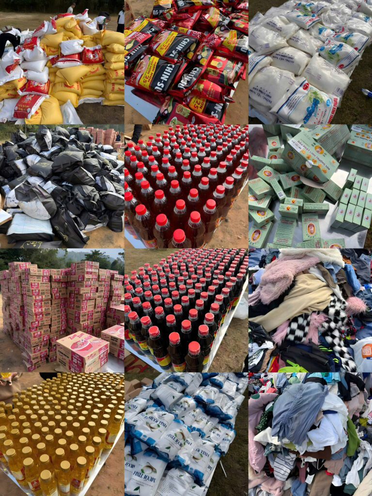 Mỗi hộ nhận được: 1 cái chăn lông, 10kg gạo, 1 thùng mì, 1 chai dầu ăn, 1 chai tương, 1 chai mắn, 1 túi đường, 1 túi bột ngọt, 1 túi muối, 1 chai dầu gió, và quần áo cũ/mới.
