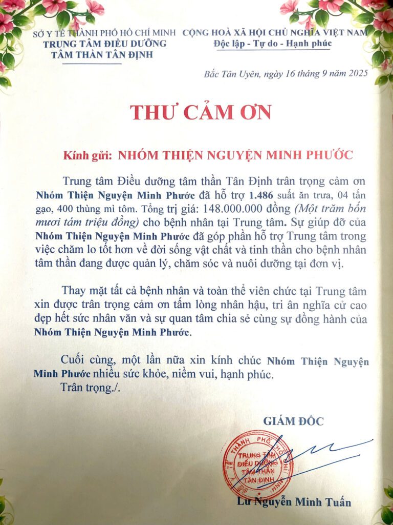 Chúng tôi xin gửi lời cảm ơn chân thành đến các đơn vị nhà hảo tâm đã luôn đồng hành và hỗ trợ chương trình từ thiện dành cho người bệnh tâm thần. Nhờ sự sẻ chia đầy yêu thương của mọi người, chương trình không chỉ mang đến những phần quà ý nghĩa mà còn tiếp thêm niềm tin và động lực cho những mảnh đời kém may mắn. Tấm lòng của quý vị thật sự là nguồn động viên to lớn, giúp chúng tôi có thêm sức mạnh để tiếp tục hành trình lan tỏa yêu thương. Mong rằng chúng ta sẽ còn gặp lại nhau trong nhiều hoạt động ý nghĩa sắp tới. Xin cảm ơn và chúc quý vị luôn mạnh khỏe, bình an và hạnh phúc.
