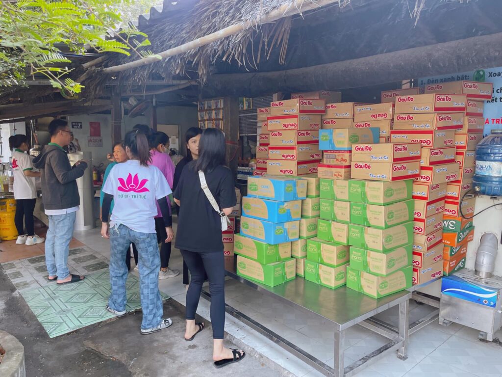 * Hỗ trợ nhu yếu phẩm cho toàn mái ấm, bao gồm: 1 tấn gạo, 100 thùng mì, 50 thùng sữa fami , 20 lốc tương, 120lit dầu ăn, 25kg muối, 50kg đường, 60lit nước mắm